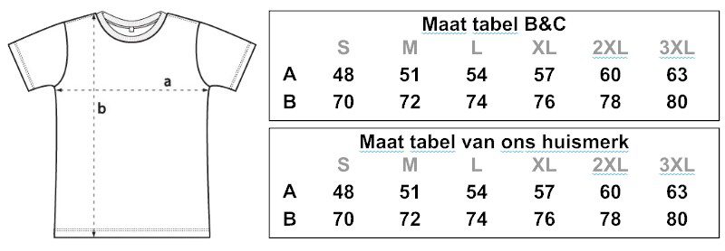 Het T-shirt is verkrijgbaar in ons huismerk (140 grams) en in het merk B&C (190 grams).
